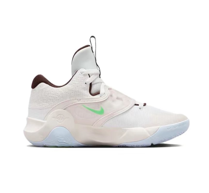 - Название технологии NIKE RENEW на задней части, AIR ZOOM сбоку на мидсоли и подмётке. Название модели KD TREY 5 аутсоли. Игровой номер Дюранта 7 и нумерация модели в виде римской цифры X на петле язычка.